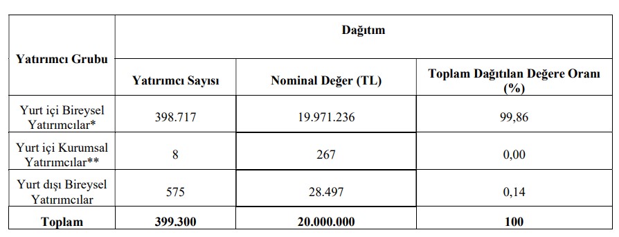 Kamuyu Aydınlatma Platformuna (KAP) yapılan açıklamaya göre, halka arz sonuçlarını gösteren tablo şöyle: