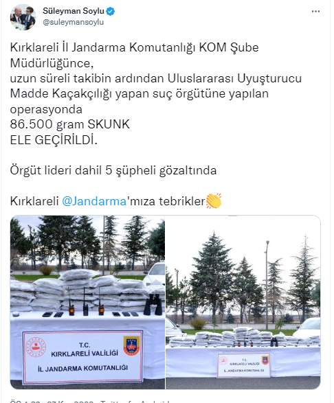 "Kırklareli İl Jandarma Komutanlığı KOM Şube Müdürlüğünce, uzun süreli takibin ardından Uluslararası Uyuşturucu Madde Kaçakçılığı yapan suç örgütüne yapılan operasyonda 86.500 gram skunk ele geçirildi. Örgüt lideri dahil 5 şüpheli gözaltında Kırklareli jandarmamıza tebrikler."